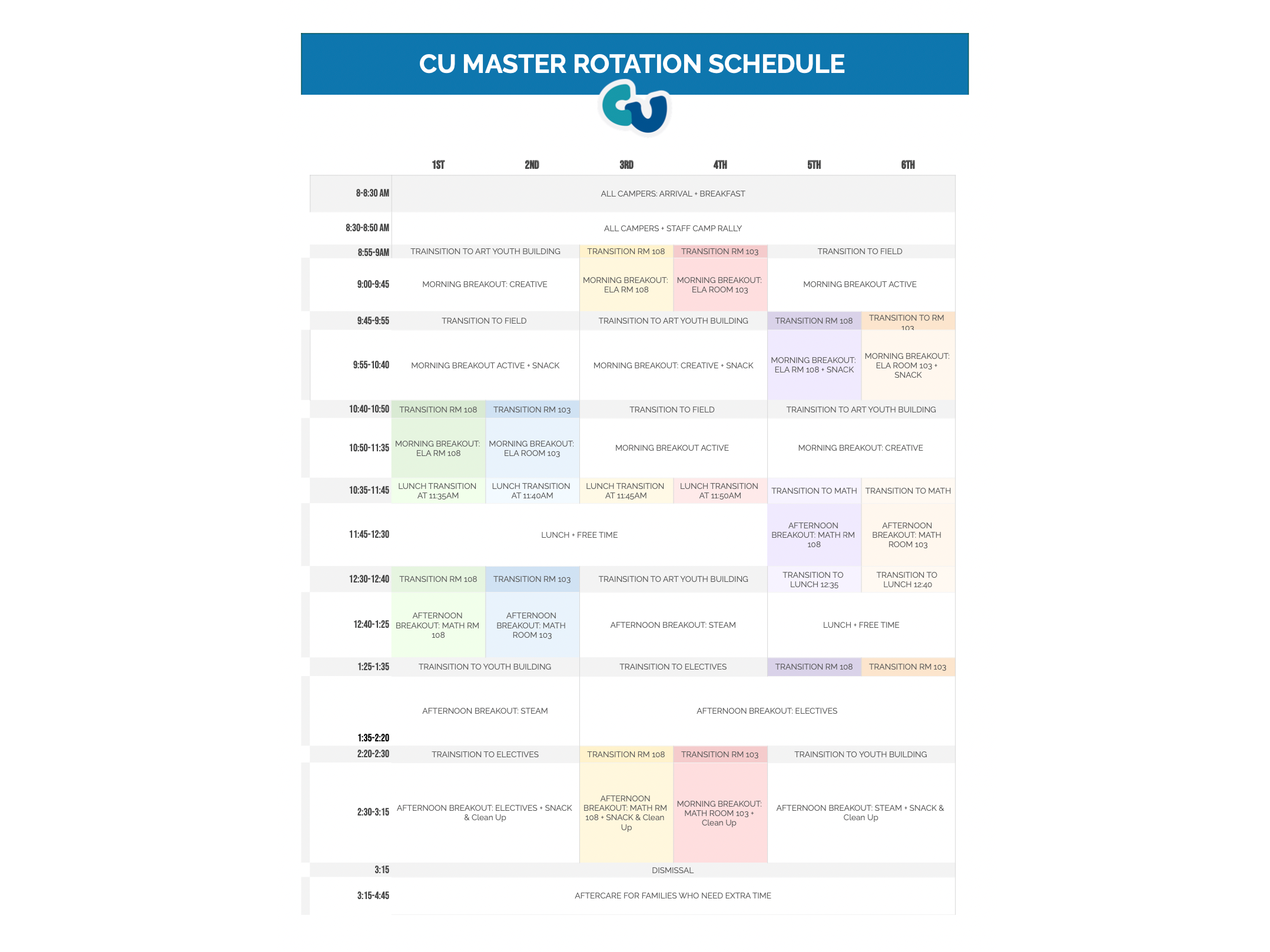 9:55-10:40AM MORNING BREAKOUT 1st/2nd ACTIVE + SNACK 2nd/3rd CREATIVE + SNACK 4th/5th ELA + SNACK